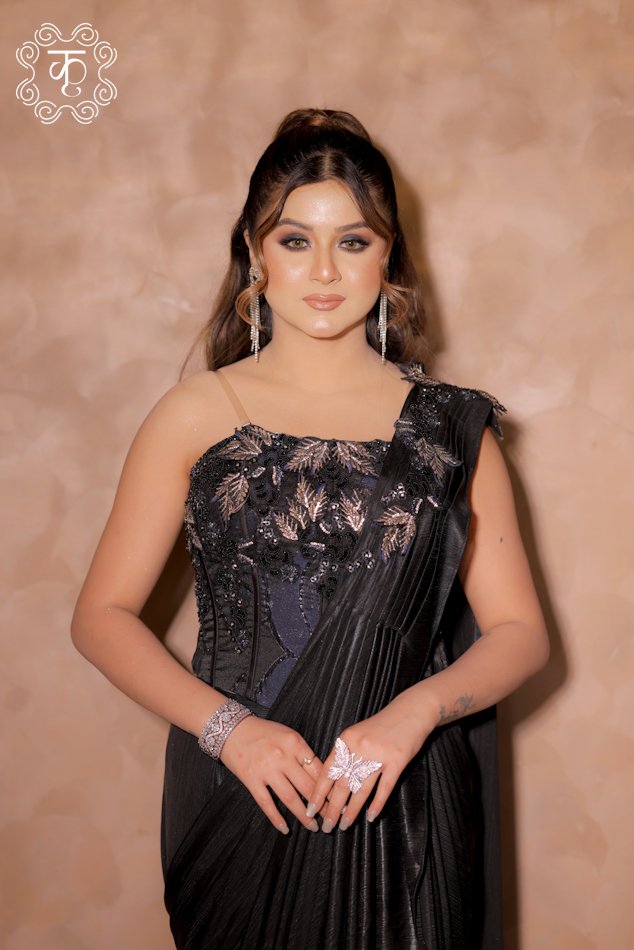 Black Drape Saree – Textured gloss chinnon with embellished hand embroidery with 3d leaves