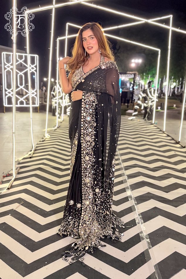 Each detail is thoughtfully hand-finished, creating a perfect harmony of tradition and contemporary glamour. Whether it’s a festive celebration, wedding, or evening occasion, this saree is designed to make a statement of refined sophistication.