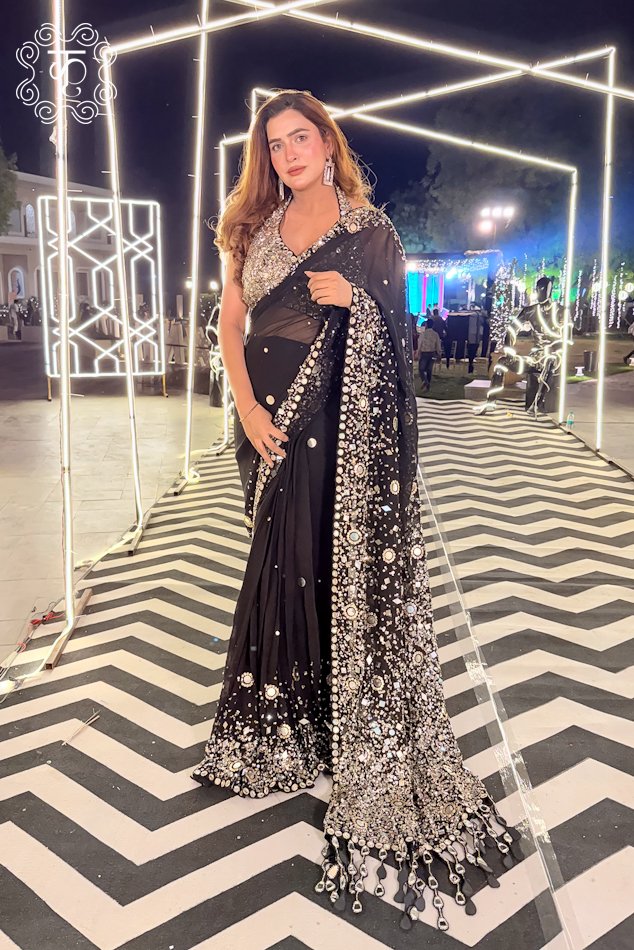 Drape yourself in timeless elegance with this exquisite black saree, intricately adorned with shimmering silver embellishments. Crafted on premium fabric, this masterpiece features delicate mirror work and fine sequin embroidery that beautifully catches the light with every movement.