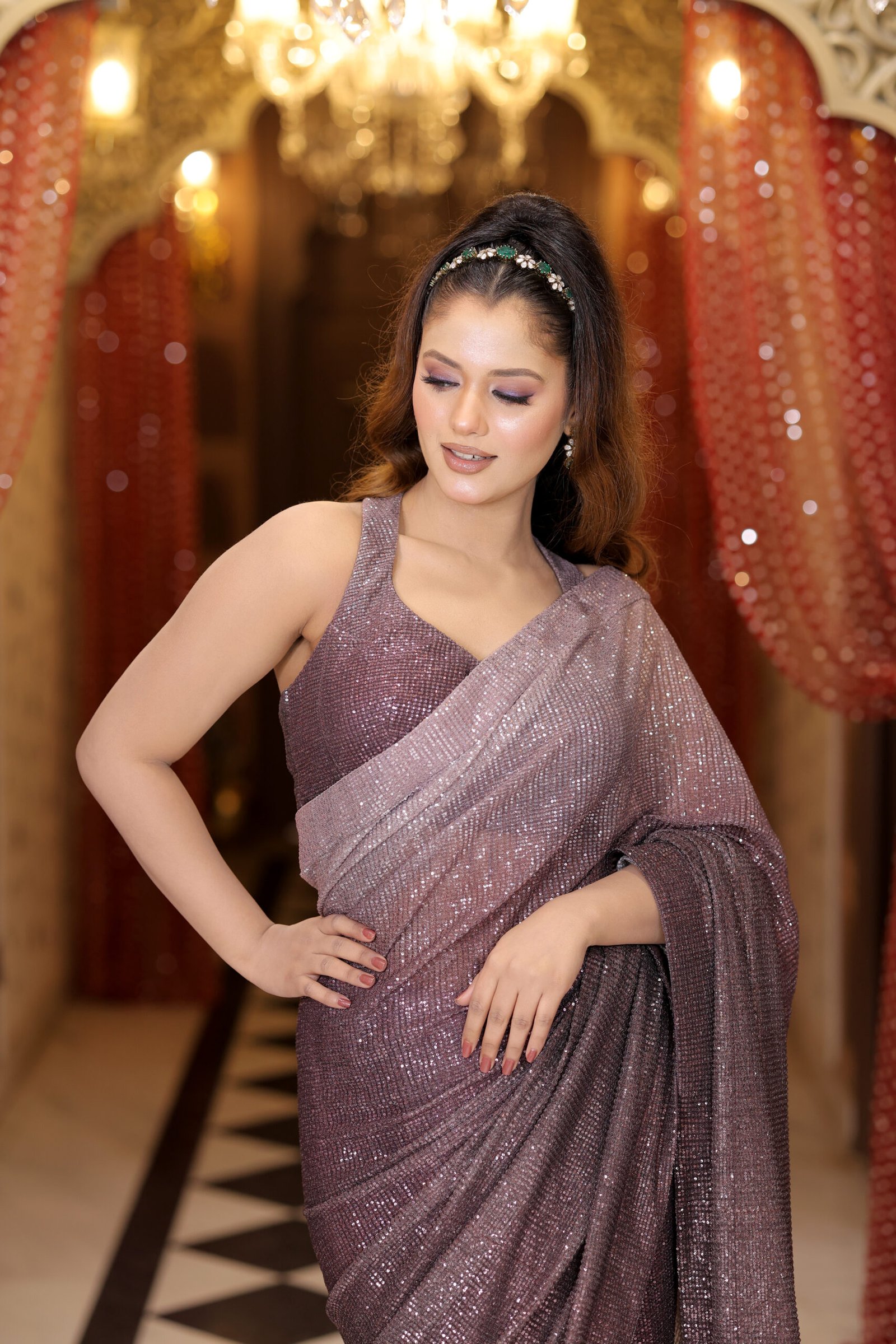 Crushed sequin fabric Saree with Blouse – Ombre Purple