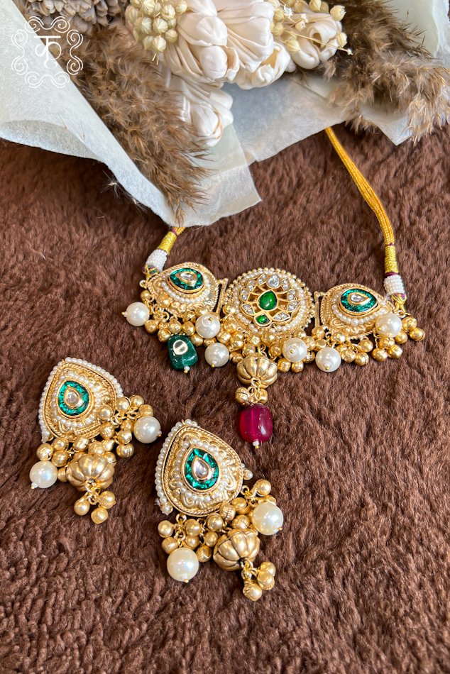 This stunning Kashmiri Necklace with Earrings set captures the rich heritage and timeless beauty of traditional craftsmanship. Meticulously handcrafted by skilled artisans, the intricate patterns and fine detailing reflect the cultural elegance of Kashmir. Perfect for weddings, festive occasions, or elegant gatherings, this set adds a regal charm to any attire. The lightweight design ensures comfort, while the high-quality materials promise durability and long-lasting shine — making it a treasured piece in your jewelry collection.