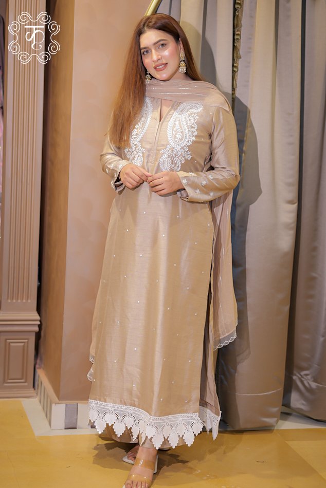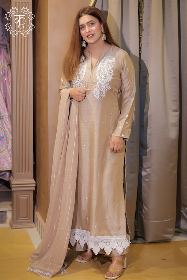 Step into timeless elegance with this luxurious outfit, exquisitely designed to make a graceful statement. Crafted with intricate machine embroidery and delicately enhanced with fine hand embroidery highlights, this ensemble beautifully blends precision craftsmanship with artisanal detailing. The outfit is further elevated with stunning golden line accents that add a subtle yet captivating shimmer.