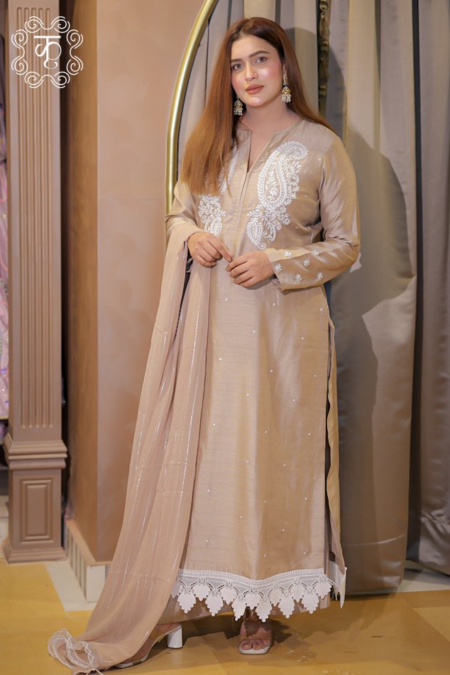 Paired with a beautifully designed dupatta and finished with premium Hakuba laces, every element of this ensemble reflects sophistication and refined style. Perfect for festive occasions, celebrations, or elegant gatherings, this outfit offers a harmonious balance of traditional artistry and modern luxury. Style it with statement jewelry and classic footwear to complete a truly regal look.